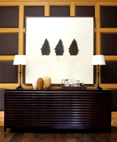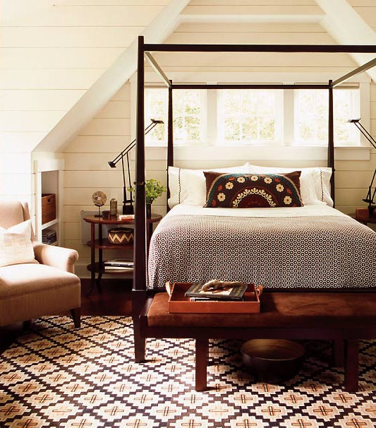 I am constantly in search of an aesthetic that blends the light and dark, raw and polished, traditional and contemporary, streamlined and clean yet still cozy and comfortable, and some of these rooms epitomize this melange. I love, love, love the four poster, slubby linen drapes, mural on the panelled wall, and yes, the painted stripey floor. Cheeky.