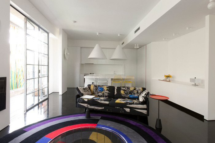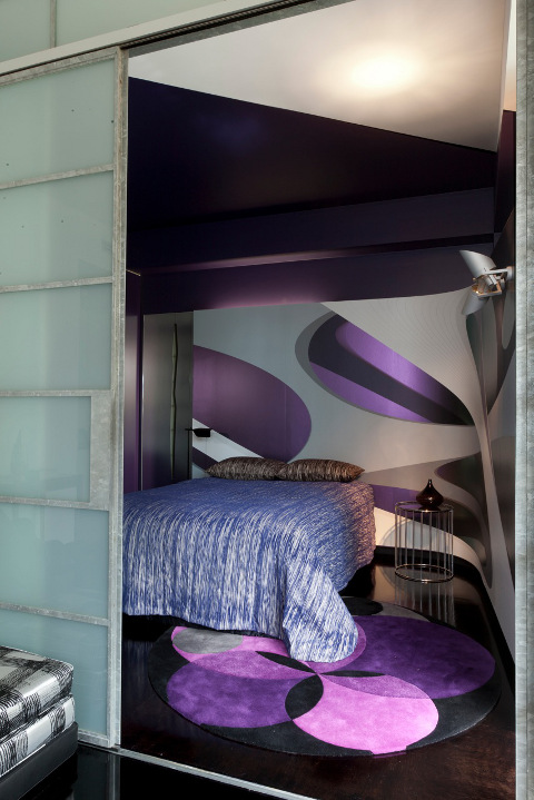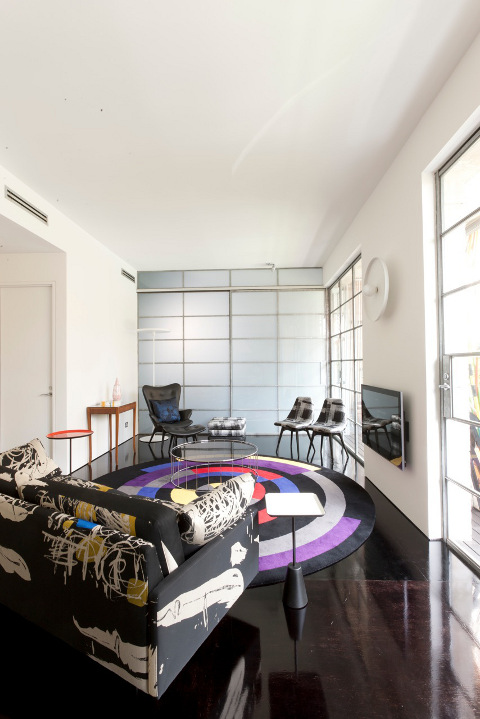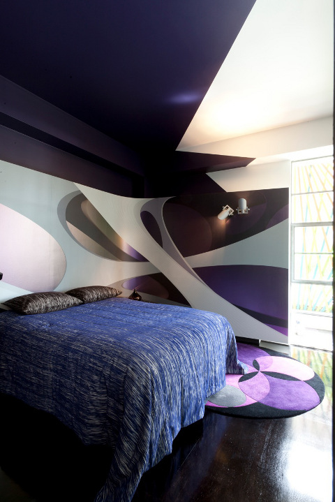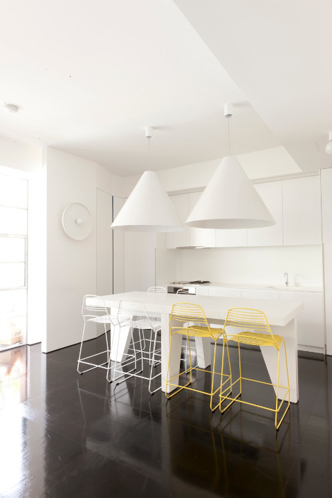 Take a stark white shell and have some fun. Exclamation marks of colour restrained by dark floors and blindingly white walls. Push it even further with purple psychedelia in the bedroom then blow the whole thing apart with a bathroom that is definitely a knockout. Interior designer Craig Spencer is known for his broodingly dark portfolio. His latest project in Pott’s Point takes his dark luxury and turns it inside out. Serious fun for the seriously brave. (You can see more of Craig’s work on Desire to Inspire here, here and here.)