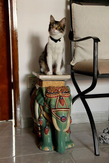 Marcel the kitten at 8 months, riding her ‘elephant’.