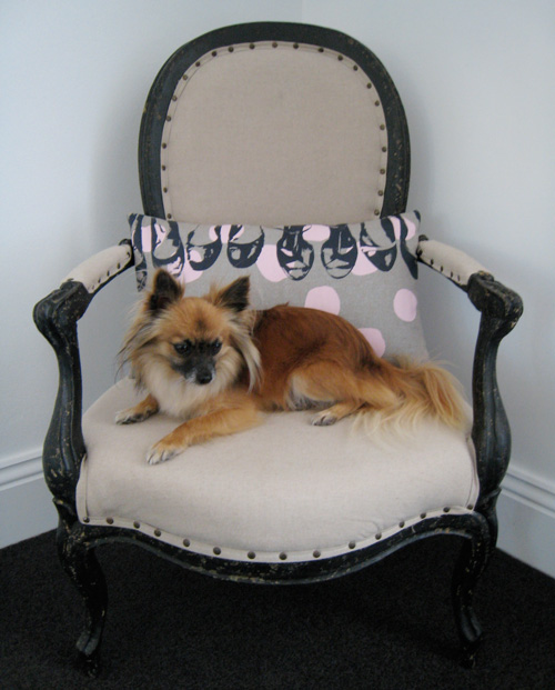 Here are a few of my favourite things… my Louis-style chair from Horgans, my screenprinted shoes cushion from La Cerise Sur Le Gateau and my little man, Rascal. He is a Pomeranian x Chihuahua. He is not normally allowed upstairs in the bedroom, but I have been sick, so I guess he caught me at a weak moment.