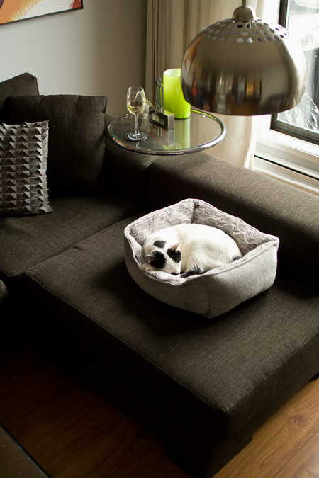 I’ve come to terms with the fact that my white chaise has become a permanent dog bed. Visiting miniature dachshund Mo enjoys a place in the sun.