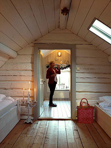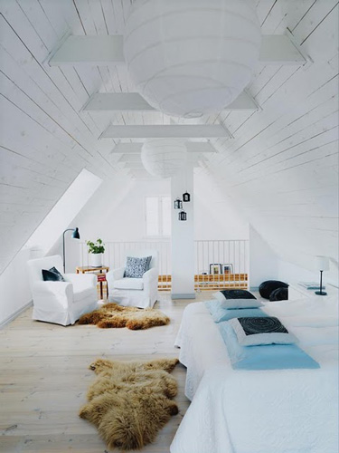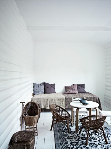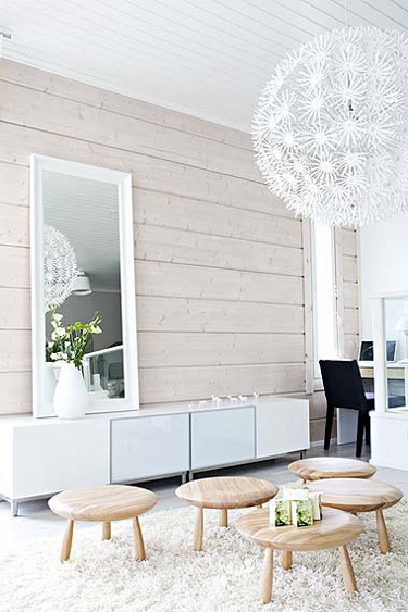 I am writing to request pics of…you guessed it…log interiors. My only issue with the logs in our new place is that I NEED light, airy interiors and log homes can be dark, dark, dark. That’s sometimes a function of lighting but also of having so much wood. We are planning to refinish and lighten the floors before we move in in August. Plus, I’ll be brightening all of the drywalled surfaces. There’s lots of darkish greens and blues. The kitchen is maple, but with a dark blue-green stain…I’ll eventually repaint that a creamy white, etc. I’m also going to update the lighting and add lots more lights. The master bedroom is actually a loft overlooking the living room and its 3 large west-facing windows (plus there are more windows in the back of the bedroom). I’m planning to paint the floor of the loft a glossy white and this will be the first place where I’ll try my big experiment: white-washing or bleaching the interior log walls. I plan to convert the place from “rustic Montana” to “Scandinavian bright”. Anyhow, if ever you have time, anything you find on log interiors would be helpful.