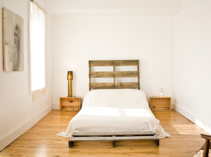 First, a question. Jesse – Are you over 21? Get a decent bed. There are many, many spare, contemporary styles that can look great just as you have dressed this one – but that will look comfy. I get the look you are going for with the "palets", but it's TOO rustic. Or Use NO headboard and use the boards to frame a modern art piece with minimal color or a great black and white photo. YOU CAN NOT UNDERESTIMATE the importance of a decent and welcoming looking bed. Do that and you will need no couch. In fact – you need change nothing else in the whole place. Except for a set of super luxurious sheets. Sleeping in Bamboo sheets is like sleeping in cream, and they are well priced. Try a set. (It will take your bedtime activities to a new level as well. Promise.)