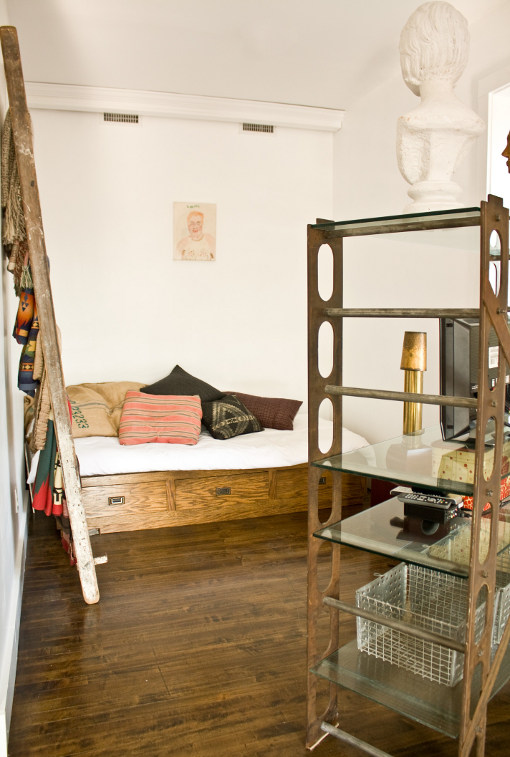 I really like what you have acomplished, it seems like a space full of treasured items collected over time and carefully edited. The head board project its very interesting, but for me, it would be perfect rather having somekind of old french headboard or otherwise changing the "stool" at the end of the bed for an actual fucntional, more comfortable one, maybe and unpolished antique french style stool, I would change any of both, since for me both seem very unpractical, they dont have the comfortable feeling the rest of the house has and a bed has to look and feel comfortable, althoug they look good. I hate plants but to have flowers around might bring that extra punch of color that could be expected, maybe wild flowers you migth just pick up from a backyard will do with the rustic aura, although your Jil Sander 'plastic bag' handbag does a great work on that matter.