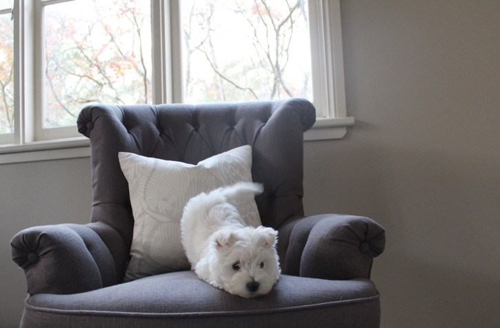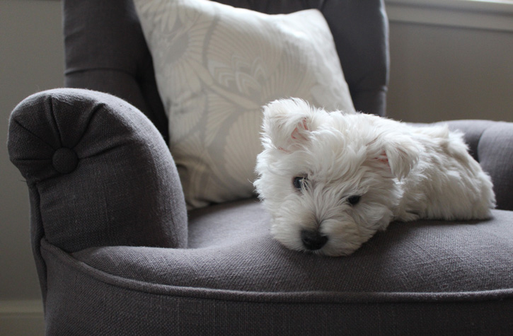 Meet Madison. She’s a 9 week old (absolutely adorable) West Highland Terrier puppy! Here’s Madi on a steel grey button back chair with a Florence Broadhurst ‘Aubury’ cushion.