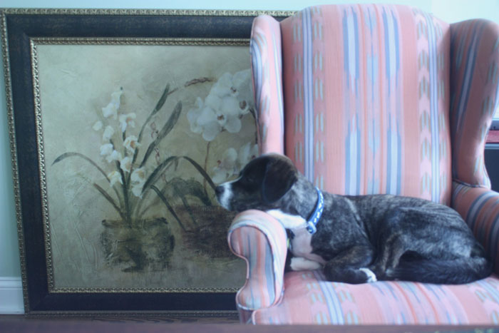 Locksley thinks, ‘She REALLY needs to get this chair covered.  AND hang this picture!’
