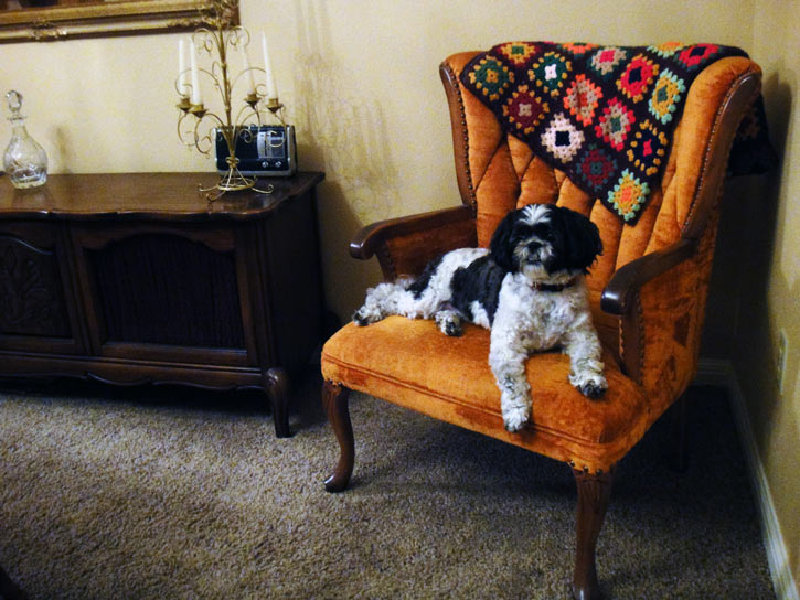 This photo is my 5 year old Shih Tzu, Oscar, on my Grandmother’s antique orange velvet chair.  You can also catch a glimpse of her beautiful record player next to it. Oscar always makes himself right at home; He has never met a chair he didn’t like!
