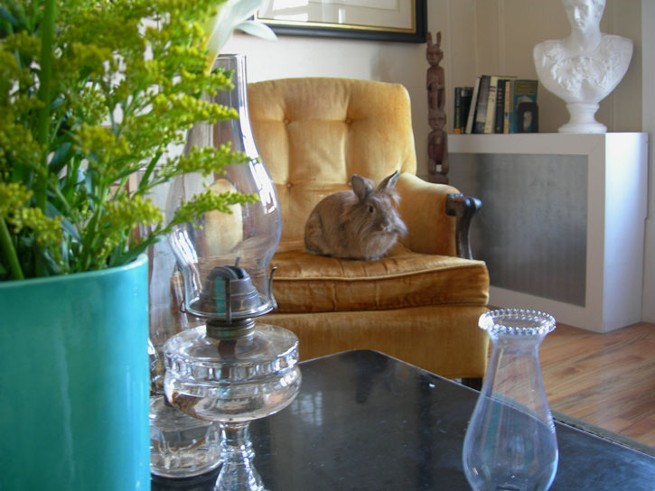 A photo of my Lions Head Rabbit, Harriet, on our vintage velvet chair. It is her favorite spot in the house.