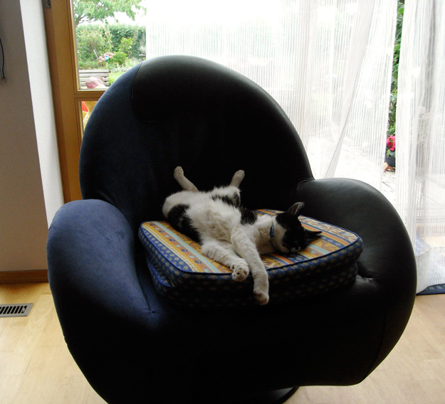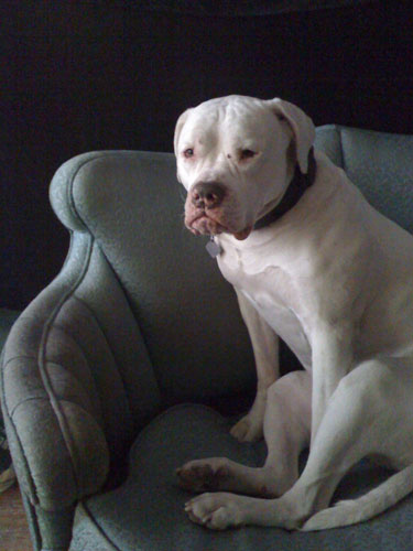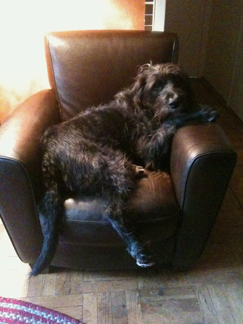 This chair can fit two people. It’s Archie’s favorite chair. He’s a 3 year-old Giant Schnauzer/Italian Spinone mix I adopted from the ASPCA. Or maybe he adopted me?