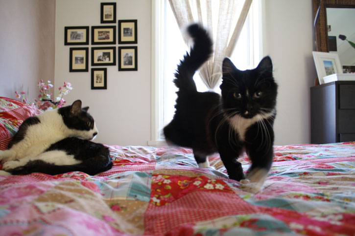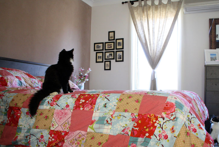 2/3. This is Slouchy and Eva hanging out in our bedroom. They love to sleep on the bed because the heating duct is in the roof and blows directly down. Very comfortable during winter. This is my favourite patchwork quilt cover, by PIP Linen.