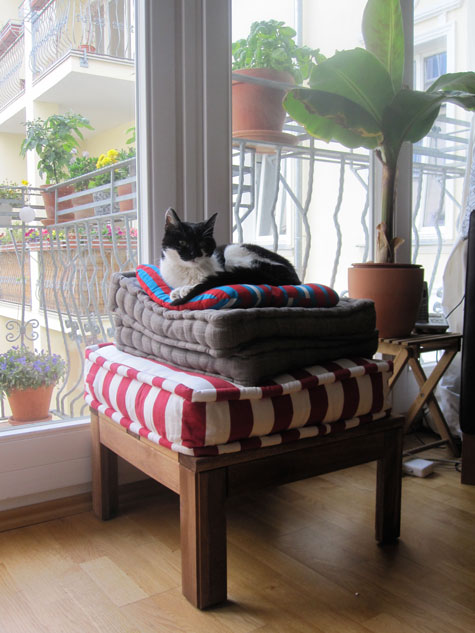 Great idea, nice photos. How old your cat who was sitting on the bed and watching window?
