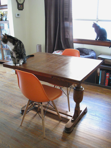 Attached are photos of my cats approving (or rather, indifferently noticing) the new Eames-style chairs gracing my dining room. I have no design sense at all, hard as I may try, so I am mostly sending this on the insistence of a dear friend who does have style and got me hooked on Desire to Inspire. I simultaneously love and fear color, but these orange babies were love at first sight. The wide-eyed tortoise-shell kitty is Linus (he can do the Puss’n’Boots big-dewy-eyed stare that can melt steel) and the black kitty is Cimarron (a fierce foster cat who has a thing for sleeping on people or my violin case).