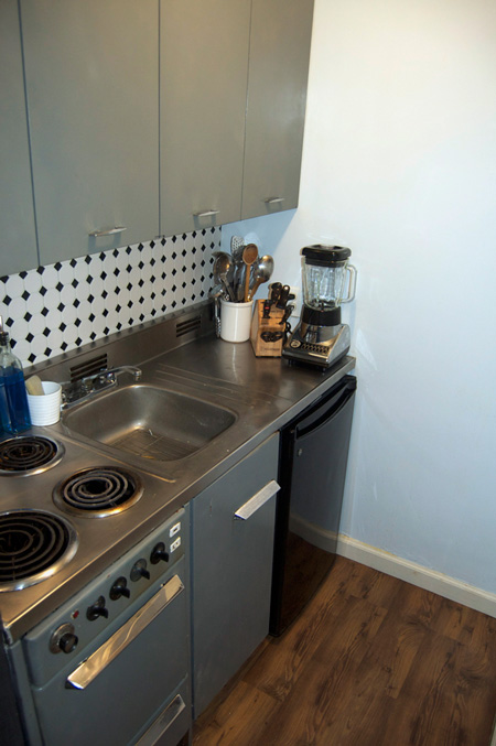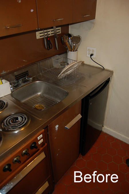 Welcome to Paul’s teeny tiny New York kitchen! He worked some magic on the space, transforming it from REALLY awful to funky and modern for just $285!! (He’s got the breakdown of costs on his blog). I had to poke fun in my response to his email, saying no one cooks in NY anyway (doesn’t everyone use their stoves to stash off season clothes?), but he claims he cooks in his kitchen often. And I bet he’ll be cooking even more now that it’s not such an eye sore. Great job Paul!!