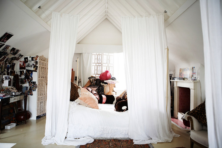 Total Rock Star/Rich Hippie vibe — some grand old pieces mixed with totally over-the-top touches like the lace-draped bathroom? Dressing room? I unexpectedly loved the silver couch. It looks positively neutral in the setting.
