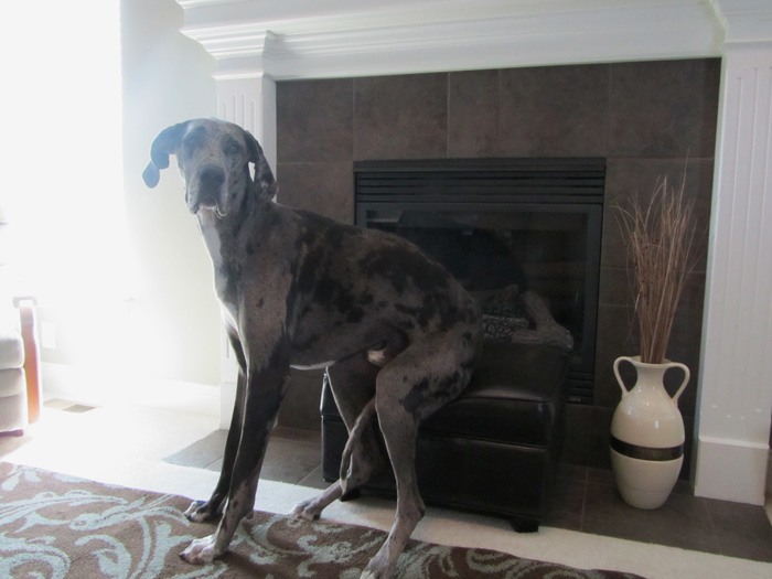 This is our 2 year old great dane Jonas, sitting on our leather ottoman. He loves sitting like this on couches, chairs, or on our laps!