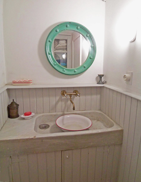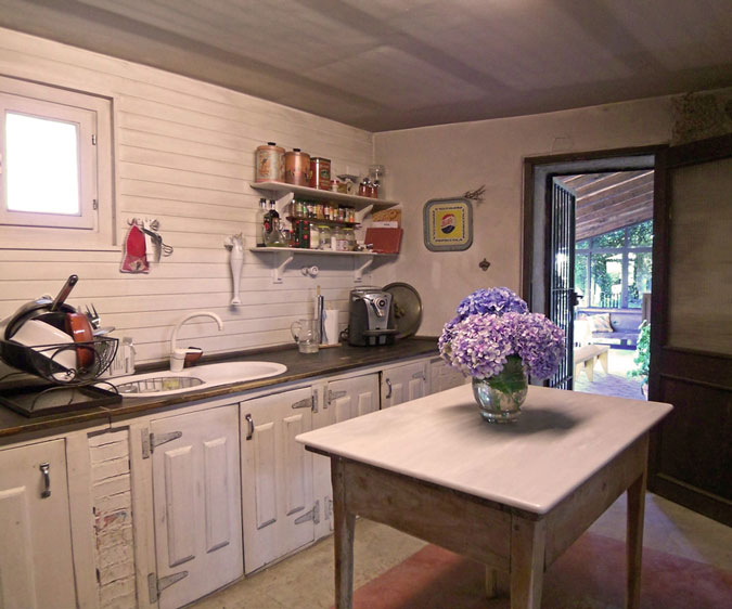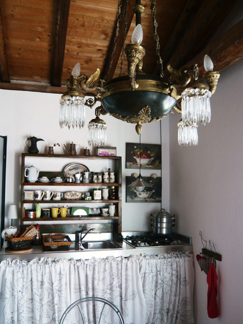 This next reader’s home belongs to Dana. I featured her Italian villa last year, and today I’d like to share her lakeside home (“darsena sul lago” = dock on the lake) on Lake Como. It’s 35 sq m, with wooden beams and white walls, furnished with antique Asian furniture and flea market finds. There is a steel trap door in the floor to access the private boat dock and a cantilevered terrace with incredible views of the lake. So lovely! Not sure what I love more – the views or that kitchen!