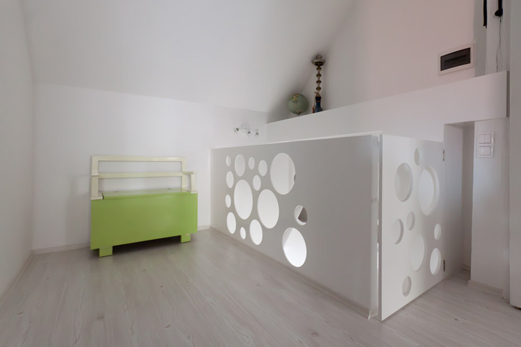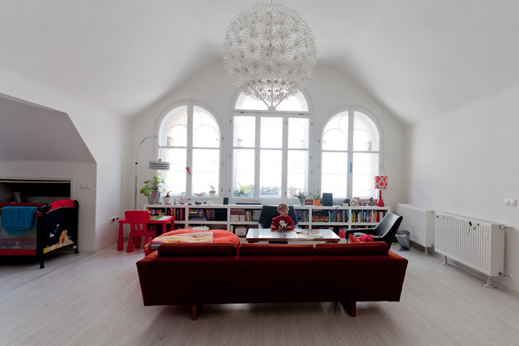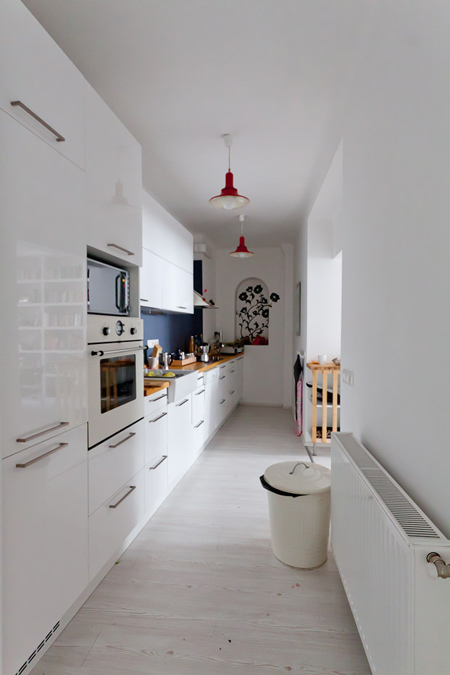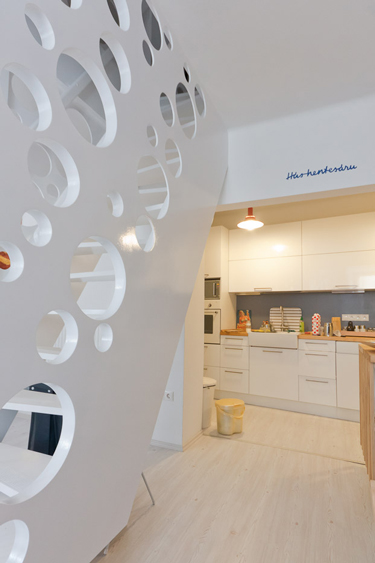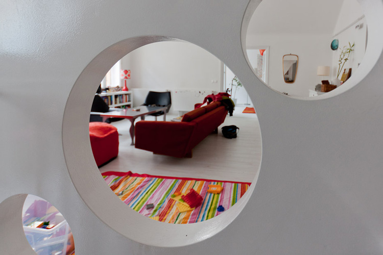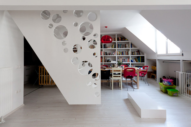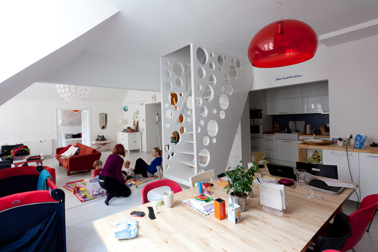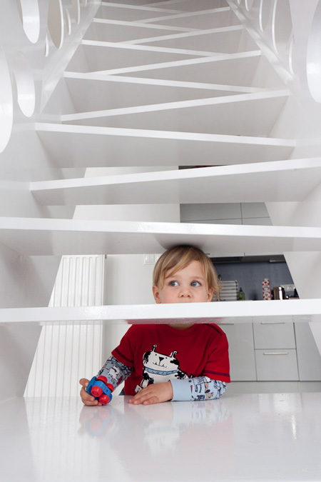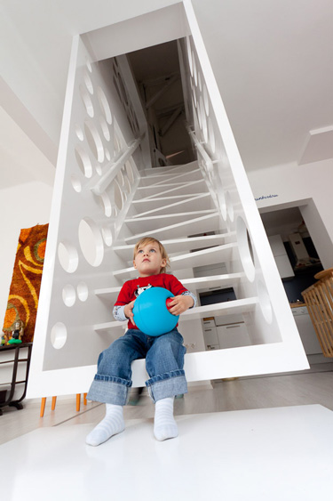 When you’ve got a staircase that is a focal point, in this case it descends right in the middle of an open plan apartment, it’s worth making it special. This apartment in Budapest is the home to a young and creative family with 2 children. The stairs form a divider between the living room and kitchen/dining room and architect Biljana Jovanovic was given the task to make it a playful. Because the stairs had to be steep (not ideal when there are children involved), Biljana angled each step to provide more surface area. I think these are alot of fun and such a clever way to turn something that could be so generic into the main attraction. (Full story here, photographed by Gerardo Altemir)