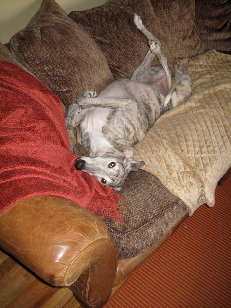 Our greyhound Hawk cooling his lollies on our Dino Mark Anthony custom sofa. Hawk turns 10 on August 21. 🙂