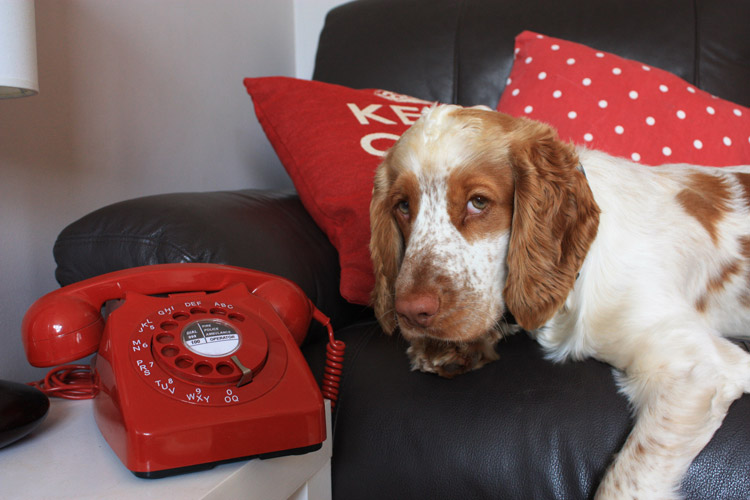 Please find attached a photo of Murray our 9 month old cocker spaniel on ‘his’ couch! Next to ‘his’ couch is our re-conditioned vintage telephone (Murray loves to bite the wires) also in shot are our polka dot and ‘Keep Calm And Carry On’ pillows (which at the moment Murray’s trying to hump!).
