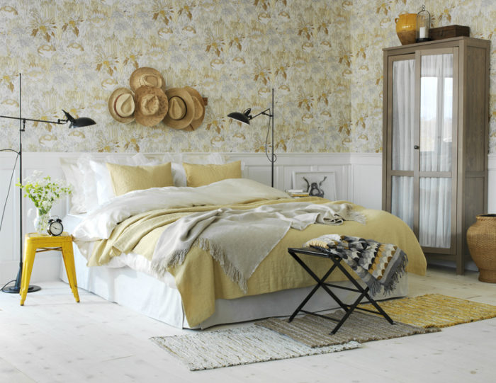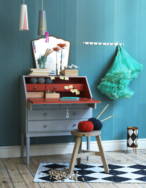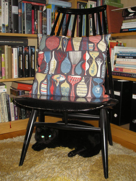 This is Agnes who loves to lie on the soft long-pile rug from late 60’s/early 70’s. The rug is from my grandparents home. The chair is called Mademoiselle and is designed by Ilmari Tapiovaara in 1956 for the Swedish factory Edsbyverken. The fabric on the pillow is called Pottery and is designed by the famous Stig Lindberg and the bookshelves in the background are the Ikea-classics called Billy.