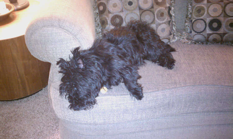 This is my Scottish Terrier Rosie. She is always on the go, until she just stops, and she loves this spot on the couch because it’s usually where I sit.