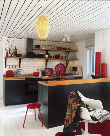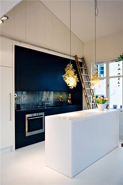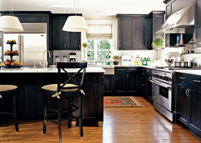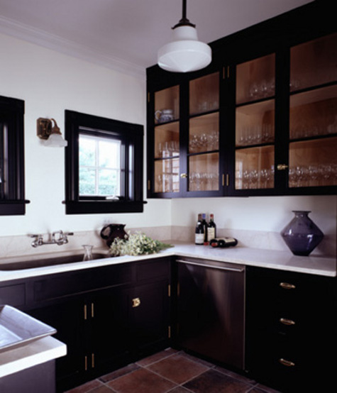Today’s reader request comes from Beverly: I am considering painting my kitchen cabinets black, at least the lowers. Most likely will do the uppers, which are doorless, in white to keep the room from being too dark. There is no natural light. Do you have any inspirations? I sure do!! I LOVE kitchens with black, whether it be just an island, or a wall, or cabinets. Now without natural light maybe painting the uppers white is a good idea but if you have a reasonable amount of wall space and you paint that white, then you likely could get away with painting all the cabinets black. Plus whatever you are displaying in the door-less uppers will show so nicely against the black. I couldn’t find many photos with black lowers and white uppers but you’ll see in many of these photos that white uppers maybe aren’t necessary.