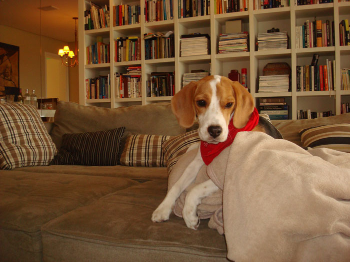 This is our 9 months old Beagle, Mario from Brazil. It’s Winter here so we have this king size blanket thrown on the couch to fit us all ( me, hubs, 12, & 8 year old sons), but Mario seems to believe it’s one owner only… Yep! 6 months of pure joy and hard laughing!