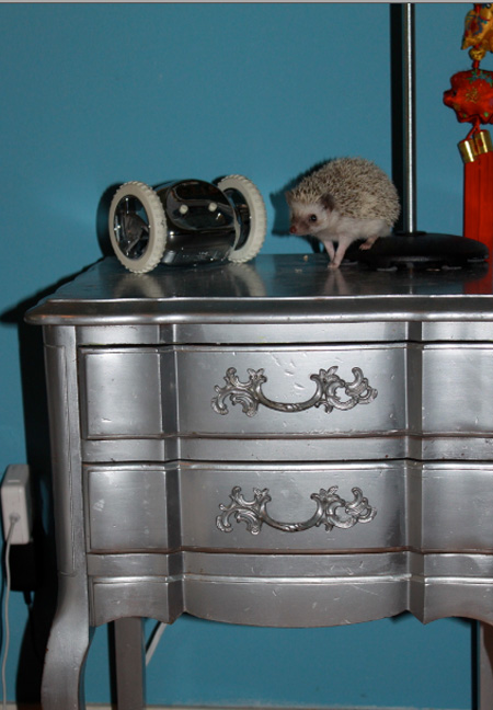 This is FannieBelle (named after my great grandmother) my pet hedgehog! Here she is pictured on an antique bedside table that I painted silver. She loves running around around my room but if I take my eye off her, even if for only a second, she quickly scurries off to explore new nooks and corners.