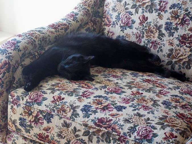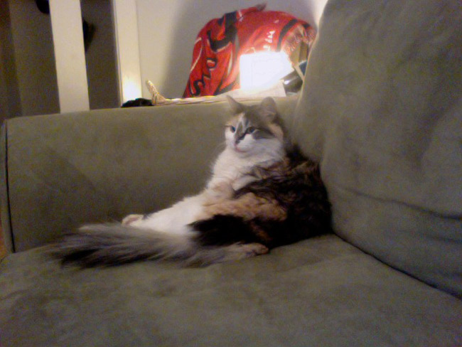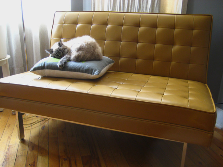 This is our cat, Mojo. She’s tiny — she weighs about 6 pounds. We call her “the koala” because of the way she grips things while she’s sleeping. I bought this butterscotch colored loveseat for $100 on eBay from a shop in Fort Wayne, Indiana a couple years ago. It’s a great piece of living room furniture and so easy to clean when you have pets! (We have another cat and a dog.)