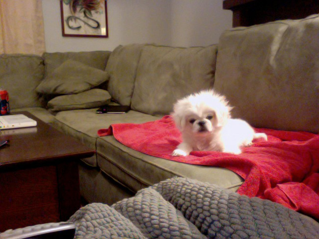 All of our animals are rescues- Bailey is the larger brown/white beagle/pointer mix. She recently lost her front right leg to a tumor and is doing wonderfully! The little white furball is Tank- I adopted him in April of this year! He is a pekingese, his mother was rescued from a puppy mill when she was pregnant. The one of him on the red towel all fluffed up was the first night home with us! I like the other one of him even more- his underbite is poking out and he looks like a very pensive man. Lastly the furry kitty is Gizmo- I couldn’t find many non-grainy pictures of her because she is always moving! I love that picture because she’s all snuggled up in the corner.