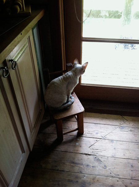 This is my mums cornish rex, India, she’s got a fabulous elegance about her, even while watching the other animals outside (she’s not allowed out because she’s got light skin and white fur sue she’d get sun burn) she sits on a chair. The second photo of her is on the food bin, with her “please feed me” face.