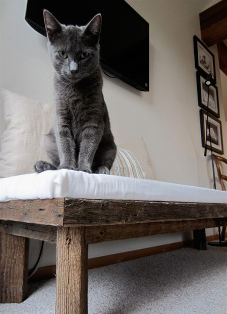 I’m attaching a photo of a daybed that my husband made, using reclaimed wood. We just upgraded to a flat screen (better late than never) and I wanted a daybed to place underneath the tv, so the wall can be used, not just watched! It is covered in our old organic unbleached cotton duvet cover. Ikea lamp behind and 3 of our photos. Chair under the photos is early 1900’s french. Oh, and the cat is Smokey.