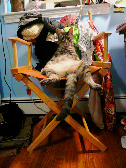 This is my cat, Tom Hanks, sitting on my orange director’s that has been with me since freshman year in college – I am now 26 and I currently live in Boston!