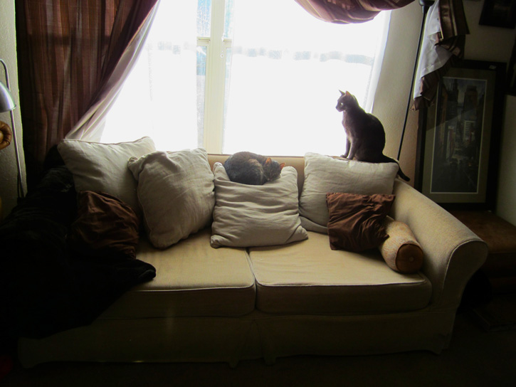 Our three cats LOVE hanging out on the furniture. I happened to snap these pictures early on afternoon when Spurfy, the big grey cat and Hooney, the smaller striped cat were relaxing on my old couch. They love standing on the back of that couch to look out the window as well as attempting to destroy said couch by scratching the arms until the fabric falls apart and I have to buy a new one! They’re really ridiculous creatures, but I still love them! Haha!