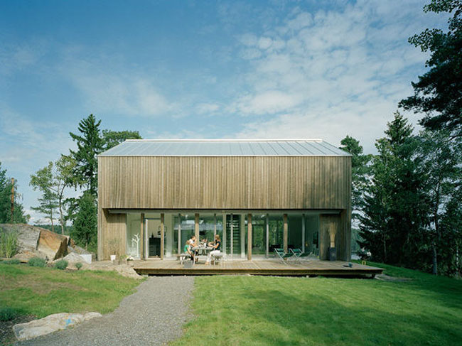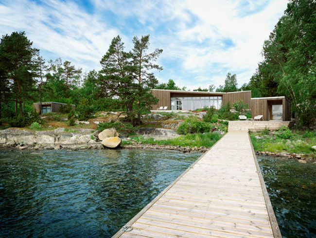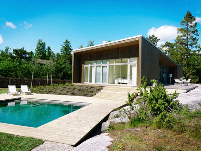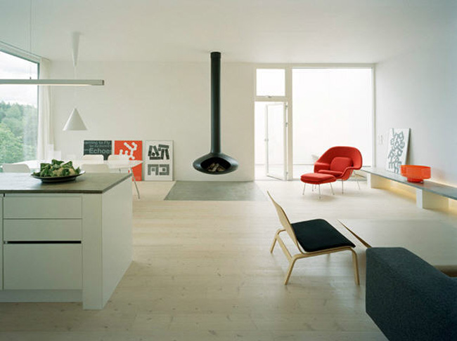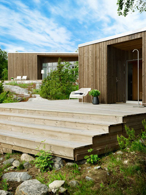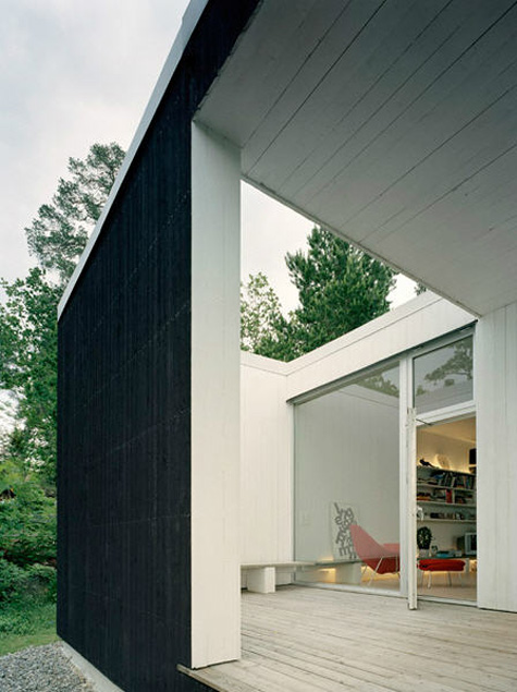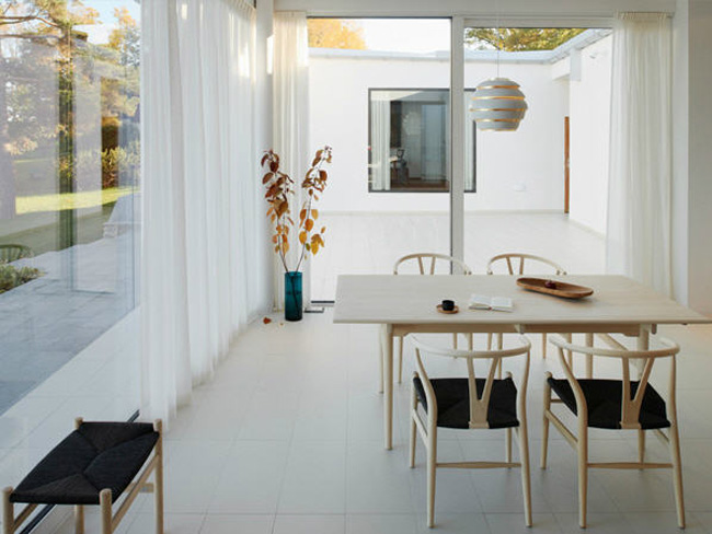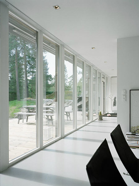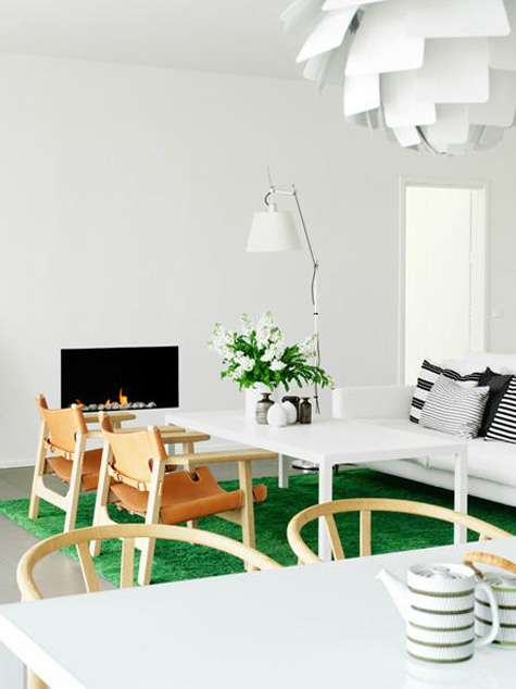 oh those swedes are good at design. the open and airy feel appeals to my need to have everything up, off the floor. even the wood burning fireplace is up, floating in air, with a cement pad below. so practical. and the green rug under the dining table adds a great pop of color and still feeling like a natural accessory, like grass. and i love all the outdoor spaces and alcoves around the house with a simple little chair. thanks for the inspiration!