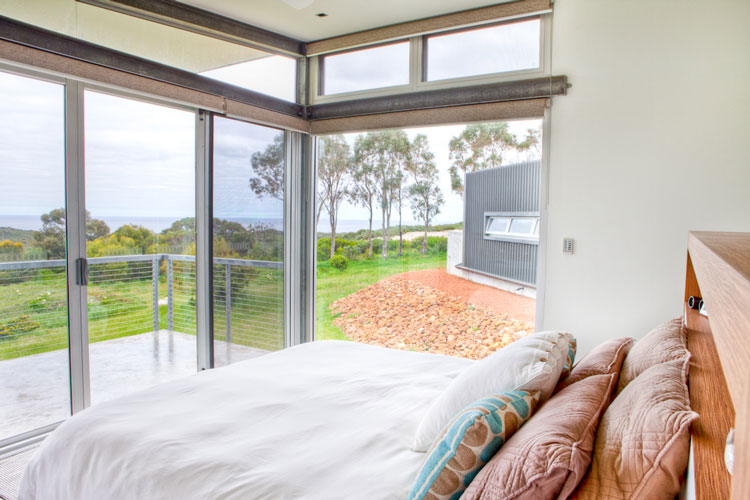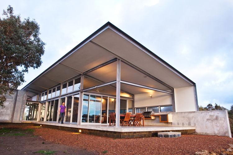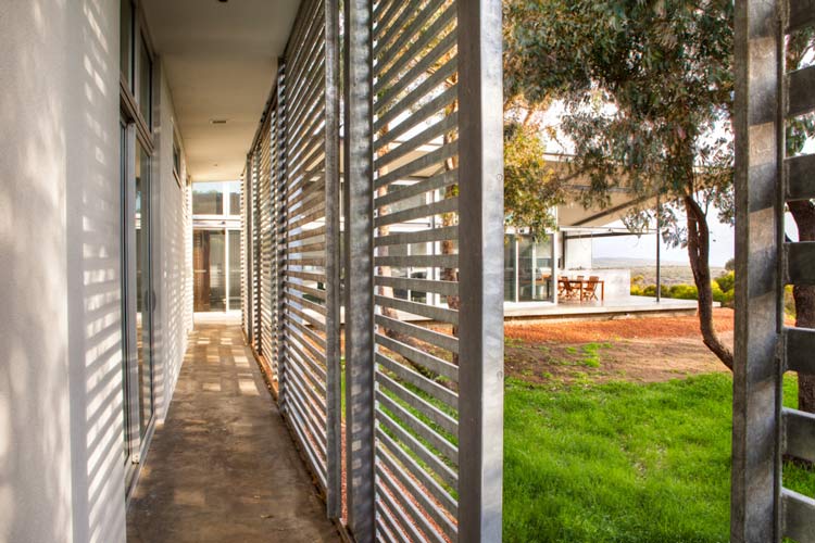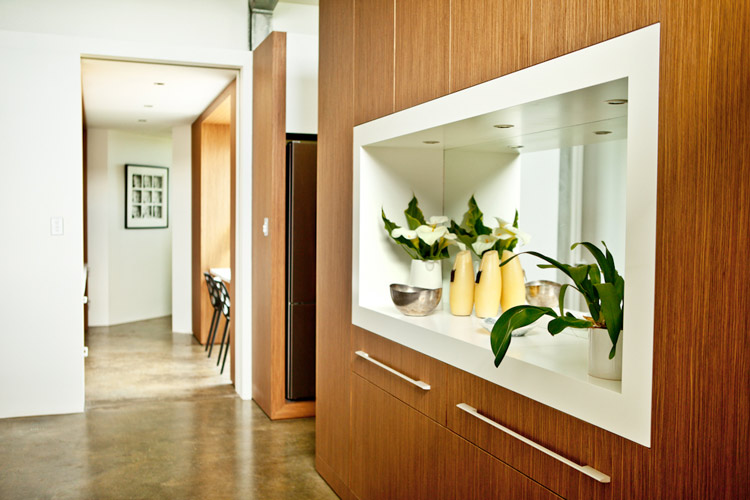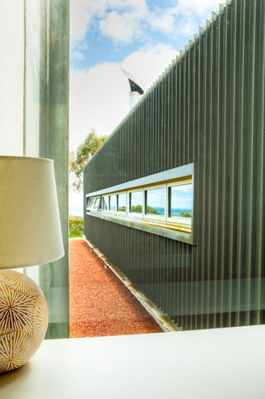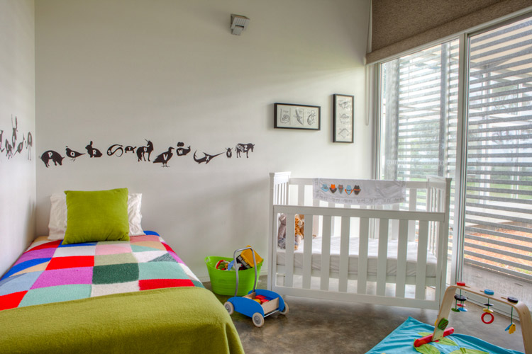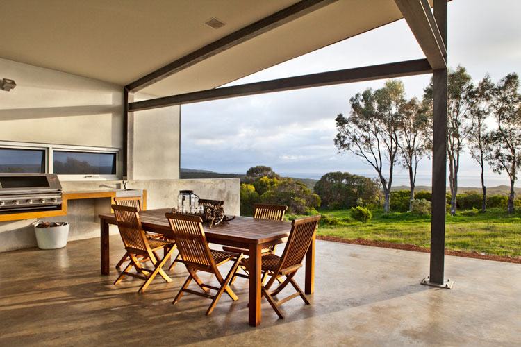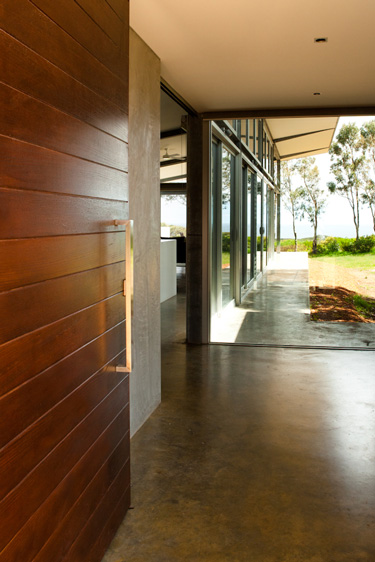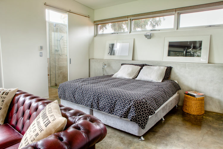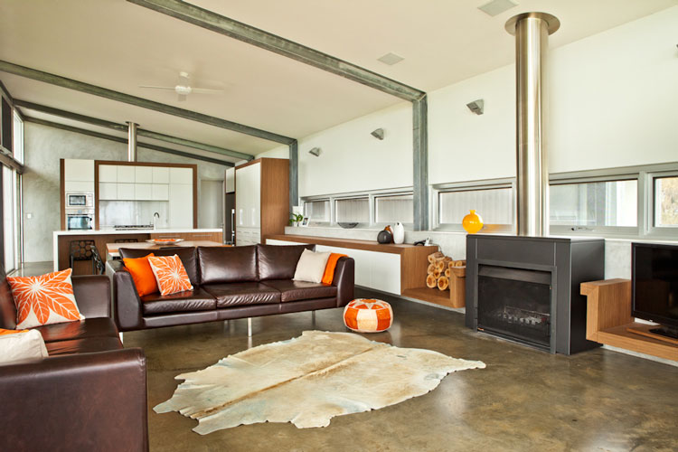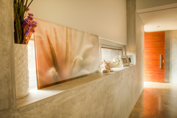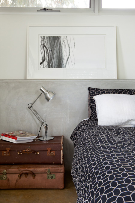 Nelly, a stylist based in Perth, Australia, emailed the other day with photos of her latest project (see her home here and reno/deco project here). It is a GORGEOUS house. She styled it for a photo shoot organized by Scoop Publishing which can be viewed online here – see pages 114-124. The house is an amazing, super-contemporary and quite sustainable weekender for a young Perth-based family who enjoys the wine, food and beach region of Margaret River. It was designed by Craig Steere Architects. It is quite minimalist inside, but I’ve tried to ‘warm it up’ a bit with my styling (although I was given only 3 days before the shoot to source decorative items without even seeing the house…) The artwork featured in the hallway and in one of the bedrooms (above the bed) is by Meleah Farrell. Photos by Heather Robbins of Red Images Fine Photography. Nelly certainly gave it a more homey touch – including hits of orange in the main living spaces. I really am a fan of this house, but on a side note, I think I would have loved to see something besides concrete floors everywhere. The other day I asked my husband if we should consider doing concrete in our new house but after seeing this home I think I changed my mind. I need the warmth that hardwood offers (despite the inevitable cat claw marks).