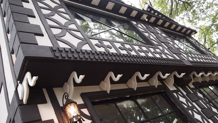 It's… cosmetically challenged, would be the kind put of putting it. From a critical point of view, what kills the look is that the detailings are too intricate and too much . The charm of Tudor homes comes from the fact that Tudor homes were often a little wonky and imperfect due to the nature of the homes and the times they were being built in. Some people show off their wealth here by living in faux Tudor homes, but the fakeness shows because the lines and angles are too straight. Whatever rocks their world though.