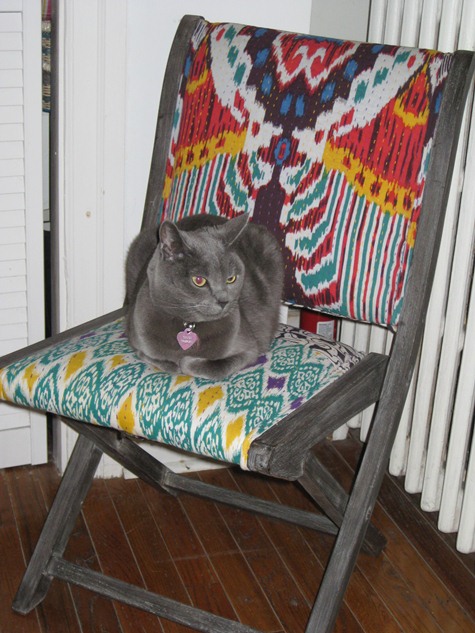 This is Chloe. She is making herself comfortable on my folding chair from Anthropologie. She sometimes sits here while I am getting ready in the morning.
