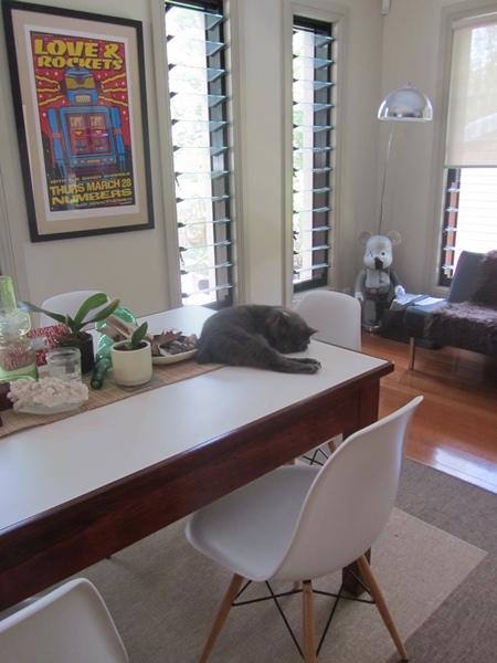 This is Moco Vinny in my cramped (but efficient) studio. She is on top of a trash find and next to a Craigslist free mid century bookshelf-type thingy. Very glamorous.