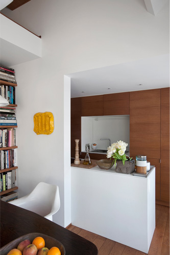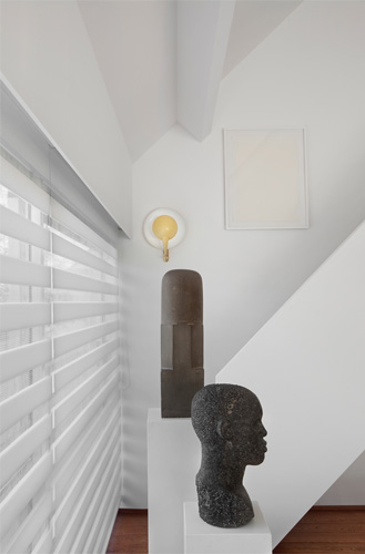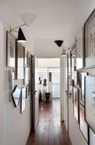 Oh, really love nearly everything about this one. That bath tub with white square mosaics and a Lichtenstein over it… is going to be a stolen idea once I redo my bath. Can anyone say what the black and white wall sconces in the hallway are?