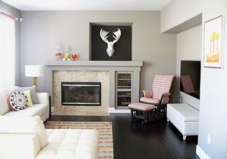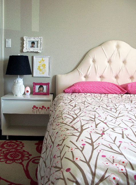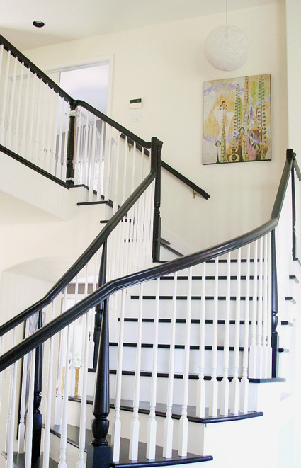 Nina is a textile designer (with a background in interior design) based in San Francisco. Her home is a showcase for many of her fabrics (Swanky Swell is her shop). Here is a bit of info Nina provided: Our home is a “tract home” with few architectural designs. It’s one of those house with similar designs with your neighbors. It has no personality and I needed to give it some. So we ripped the whole carpeted area and replace it with distressed hand scraped hardwood floors. We installed wood stair landing and stained them to match the hardwood floors. We painted the riser white. We sanded the stair post and hand rails then stained them to match the hardwood floors as well. By the end, it has almost this black and white effect through out the whole house. On the favorable side, it has high ceilings, very airy and an open plan. I’m always drawn to a loft style living. I left the wall paint white on the first floor and use them to showcase oversized artworks and objects. LOVE the colours and patterns!