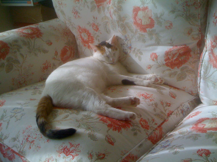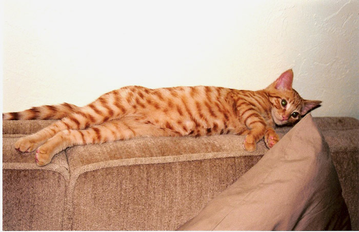 2 – A tiny Elliot, aka Wirp stretched out atop of my old 1950’s cream colored sofa.