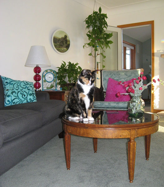This is my cat, Wilma, on my daughter’s hand-me-down table. (She had to leave it behind when she moved to Hawaii). Wilma randomly picks a spot for hanging out and today it was the coffee table.