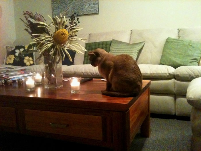 This is my Burmese cat, Ellie, sitting next to a bunch of Australian natives on my Blackwood coffee table. She’s clearly fascinated by the flame of the candle.