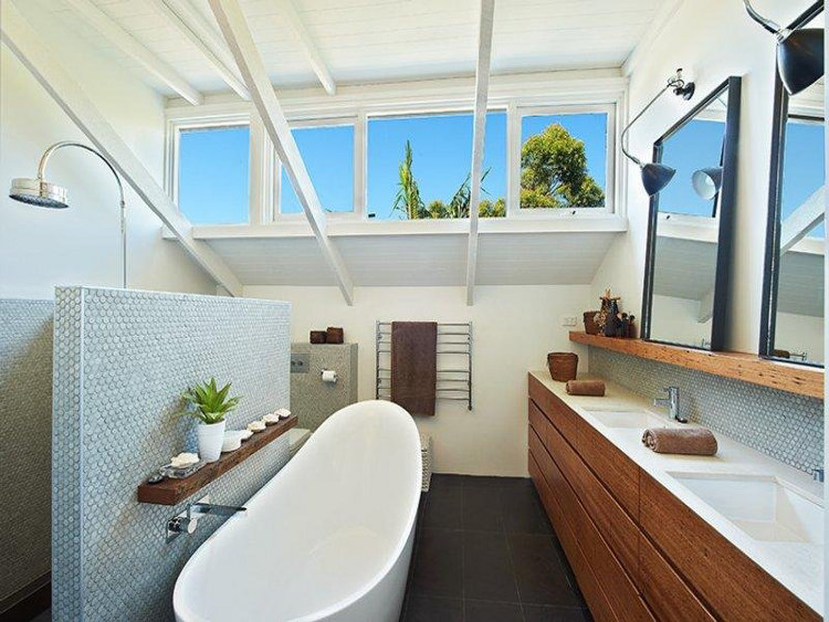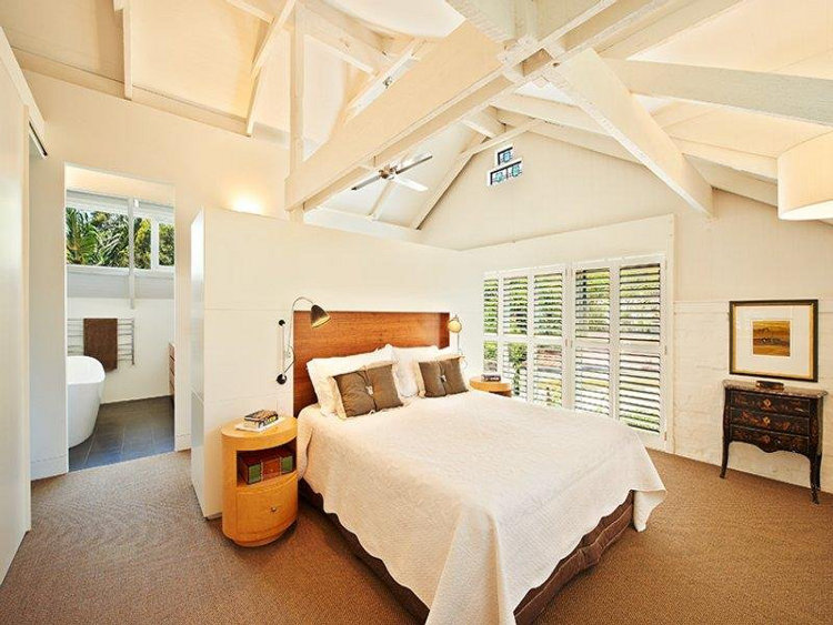 Very warm and earthy home. The bedroom and bath are especially appealing with the timber on the ceiling painted white.