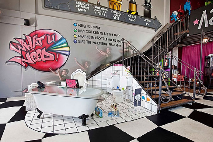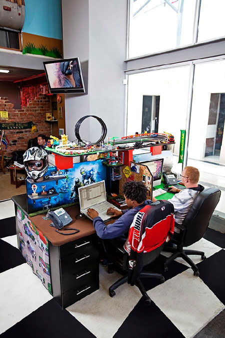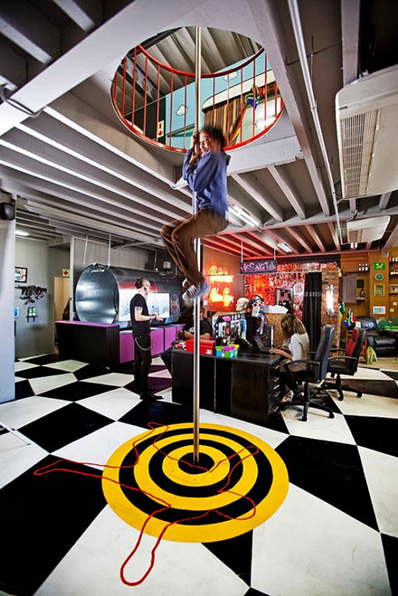 Can you imagine going to work every day and in between tasks being able to get a tattoo, get in some target practice at a shooting range, hang out in a tree house, slide down a fireman’s pole, have a milkshake snack at a canteen…all without leaving the office?!?! Yes, that is the insane workplace of Missing Link, corporate presentation designers based in Johannesburg, South Africa. Makes my drab, mismatched office with busted, dirty chairs (and everyone thinks the federal government wastes money – not on furniture they don’t!) look even worse. We can’t even get coffee without having to trudge across the street in snow… (more details via VISI)