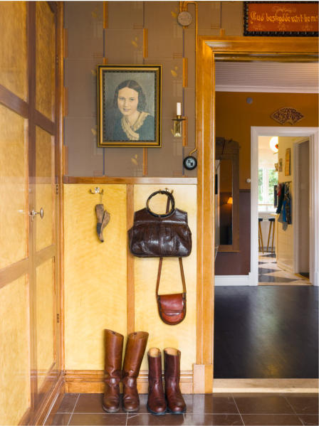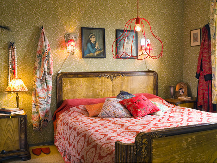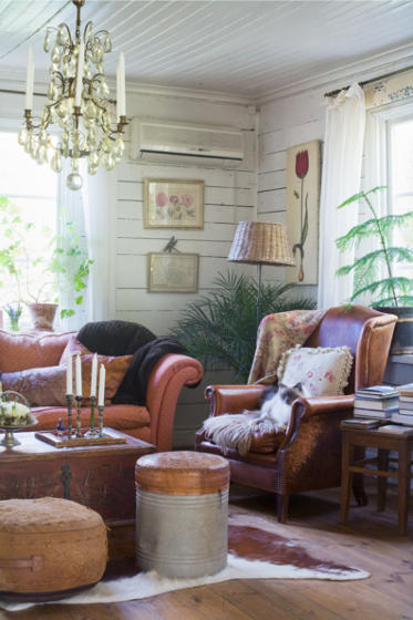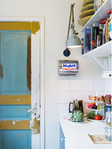 Wow so many things here that I love; the bedroom wallpaper, the rustic kitchen door, the green lampshade in the office space, the vintage bed and lots more! Thanks for the inspiration burst!