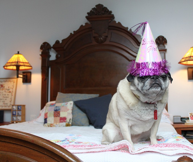 This is my pug Koko celebrating her 12th birthday on Valentine’s Day by hanging out on the antique bed I picked up at an estate sale. The vintage quilt is also an estate sale find.