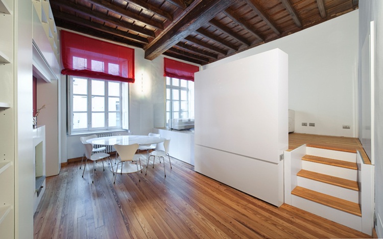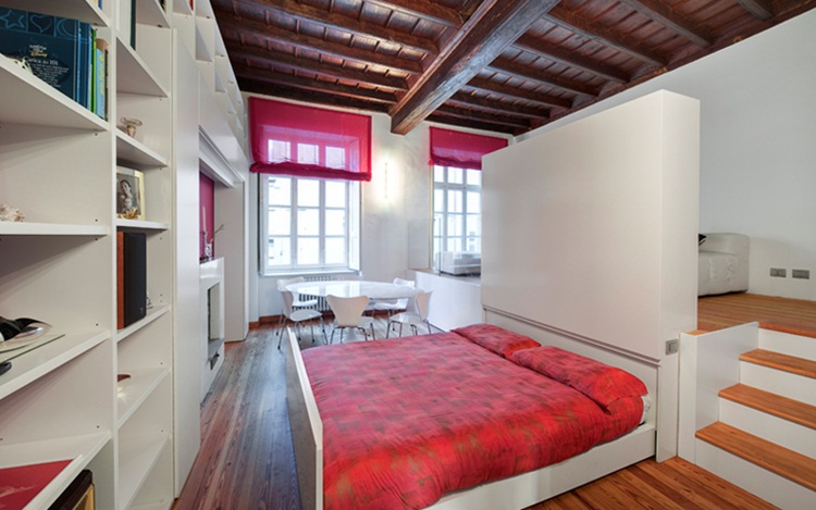 I can't say that I'm too fond of that large white entertainment cabinet right in the middle of the space though. And I hope they didn't raise the "living room" just for the purpose of hiding the bed. I think I'd rather see the bed hidden as a traditional murphy bed (folded-up against the wall) and have a more open single-level plan.