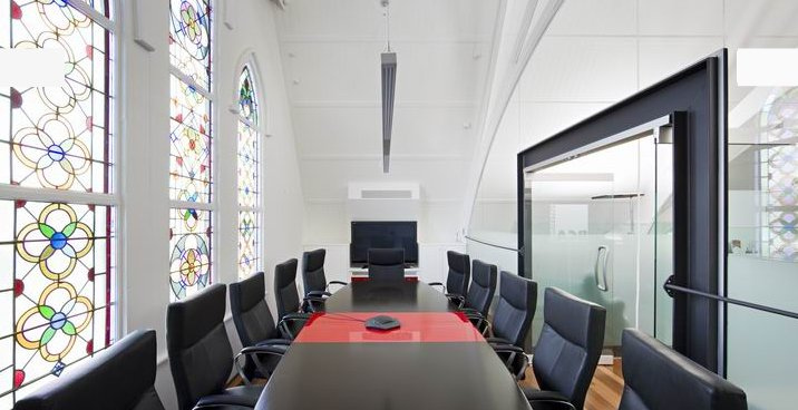 I wonder if the beautiful stained glass windows in the boardroom remind staff to act in a honourable way…a reminder of who's watching;) I really like this conversion.